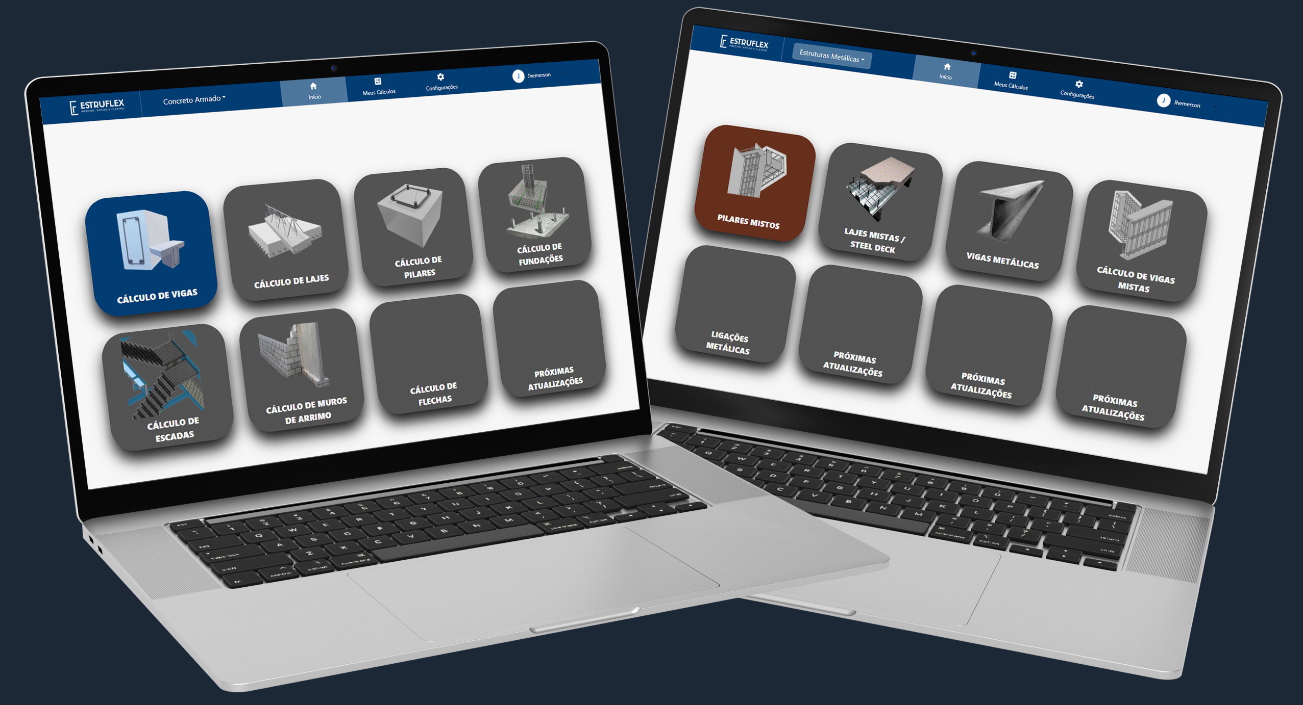 Com o Estruflex, você pode calcular elementos estruturais em formato armado e metálico de forma rápida e intuitiva, garantindo precisão e confiabilidade nos projetos.